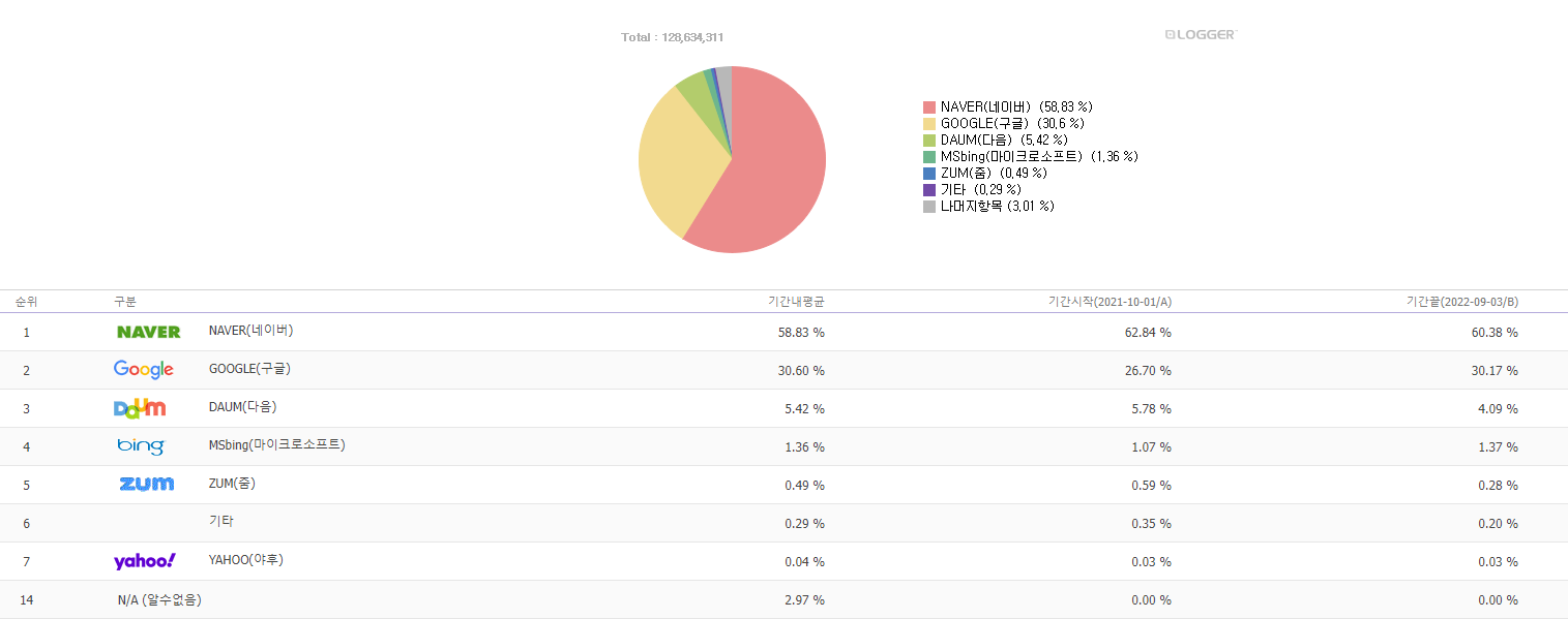 작년 9월부터 이번달 9월까지 무려 토탈 128,634,311 건의 검색량에서, 줌과 빙이 합쳐서 1.85%라는 생각보다 높은 점유율을 보임, 이것을 절대값으로 환산하면 무려 2,379,734건! 자그마치 2백 3십만 건이 넘는 검는 검색량 중에서 단 몇십건이라도 내 블로그로 유입된다면, 정말 아리가또 하지 않을 수 없음, 그러니 정성스럽게 내 블로그를 빙과 줌에 등록해보도록 하자