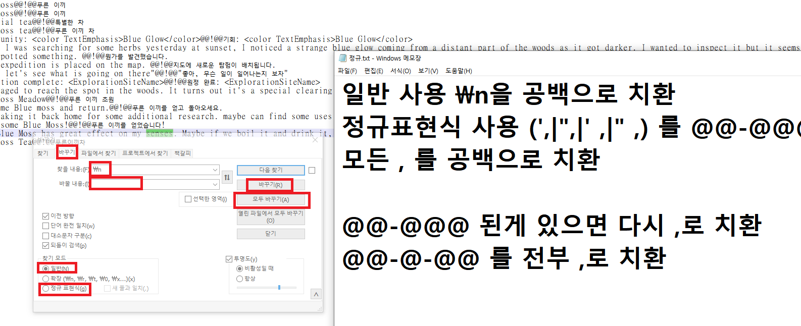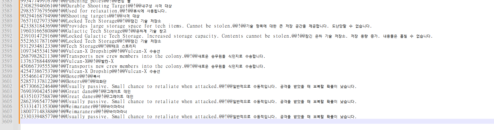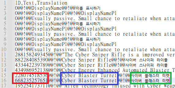 그러니 저장된 모든 번역본에서 일단 콤마를 없애버린 후, 번역 모드 업로드 전 마지막 단계에 @@!@@의 문자들만 모두 , 콤마로 다시 대체해주면 완벽하게 " 아이템 번호, 원문 언어, 기계 번역본 " 의 형태로 만들 수 있다는 이야기임. (지금 설명만 들어선 어려울 수 있음, 함 해보고 막혔을때 다시 이 포스트로 와서 보면 이해가 될 것임)