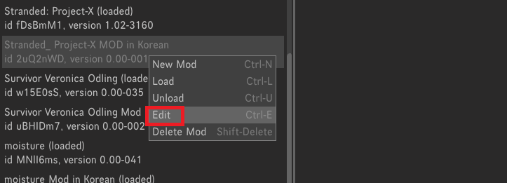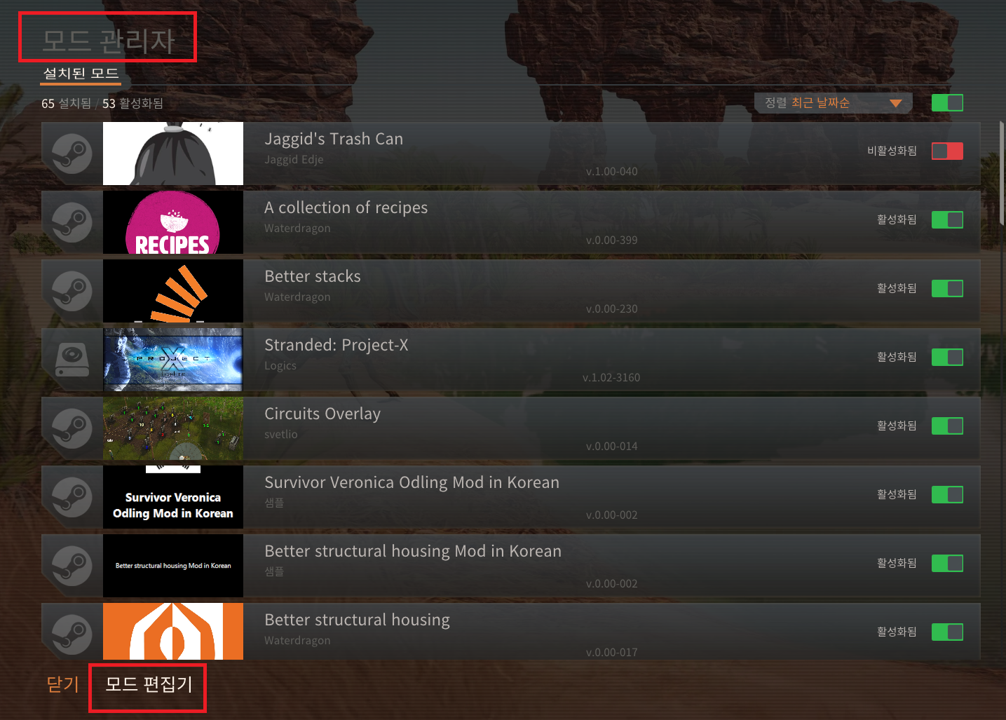 본인의 한글화가 만족스럽다면 다 저장을 눌러주고, 다시 게임으로 돌아와 모드관리자 >> 모드 편집기 진입