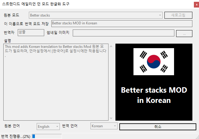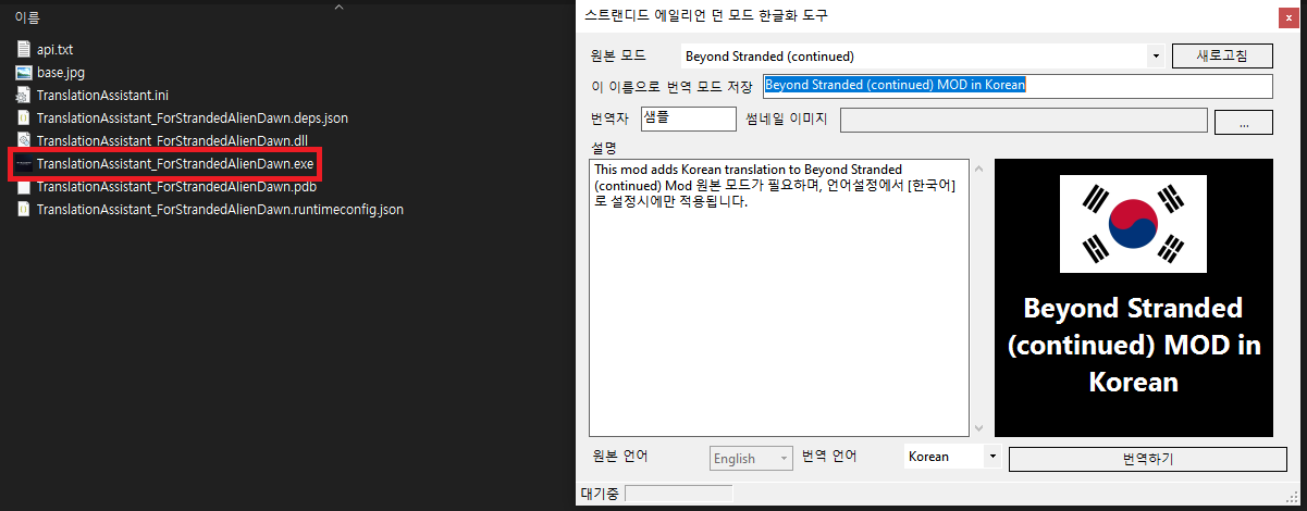 번역을 원하는 모드를 선택 후 적당히 설명과 번역자, 제목 등을 수정 후, 우측하단의 번역하기를 클릭
